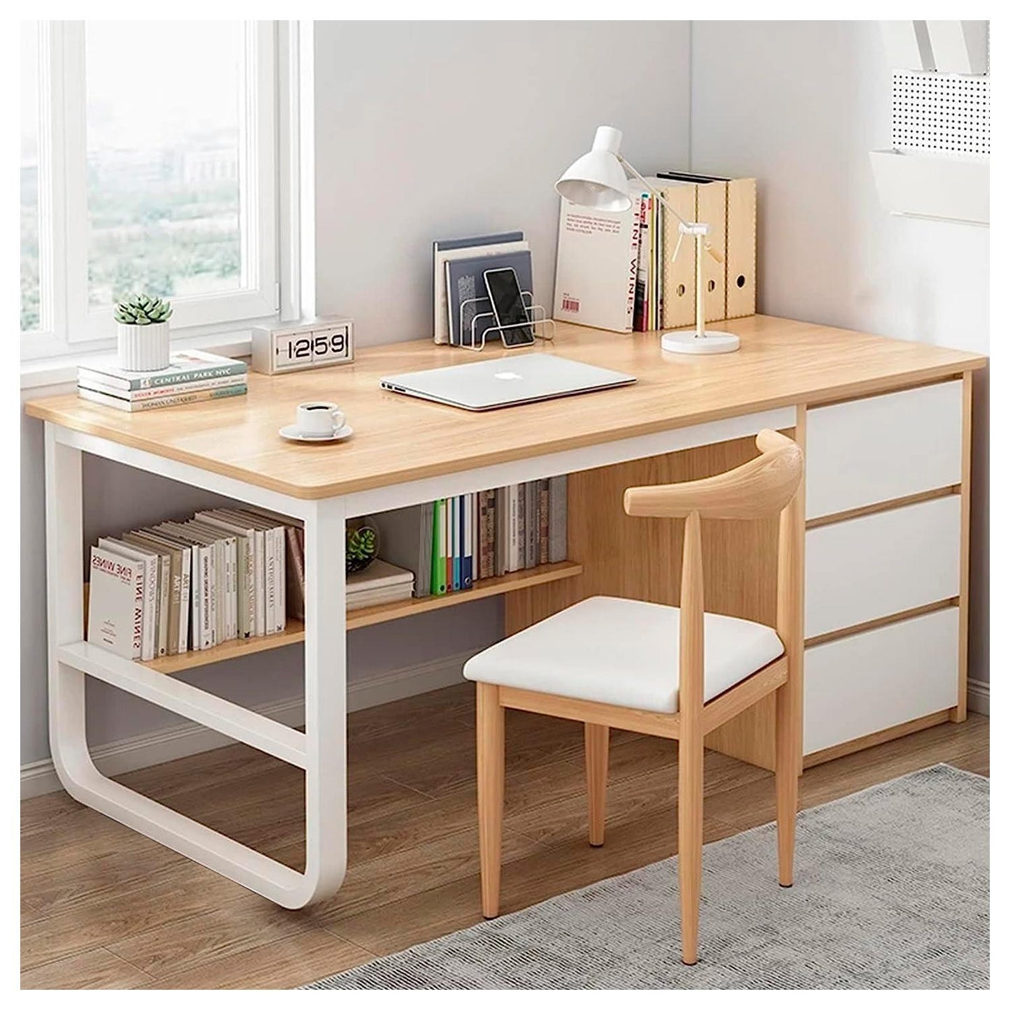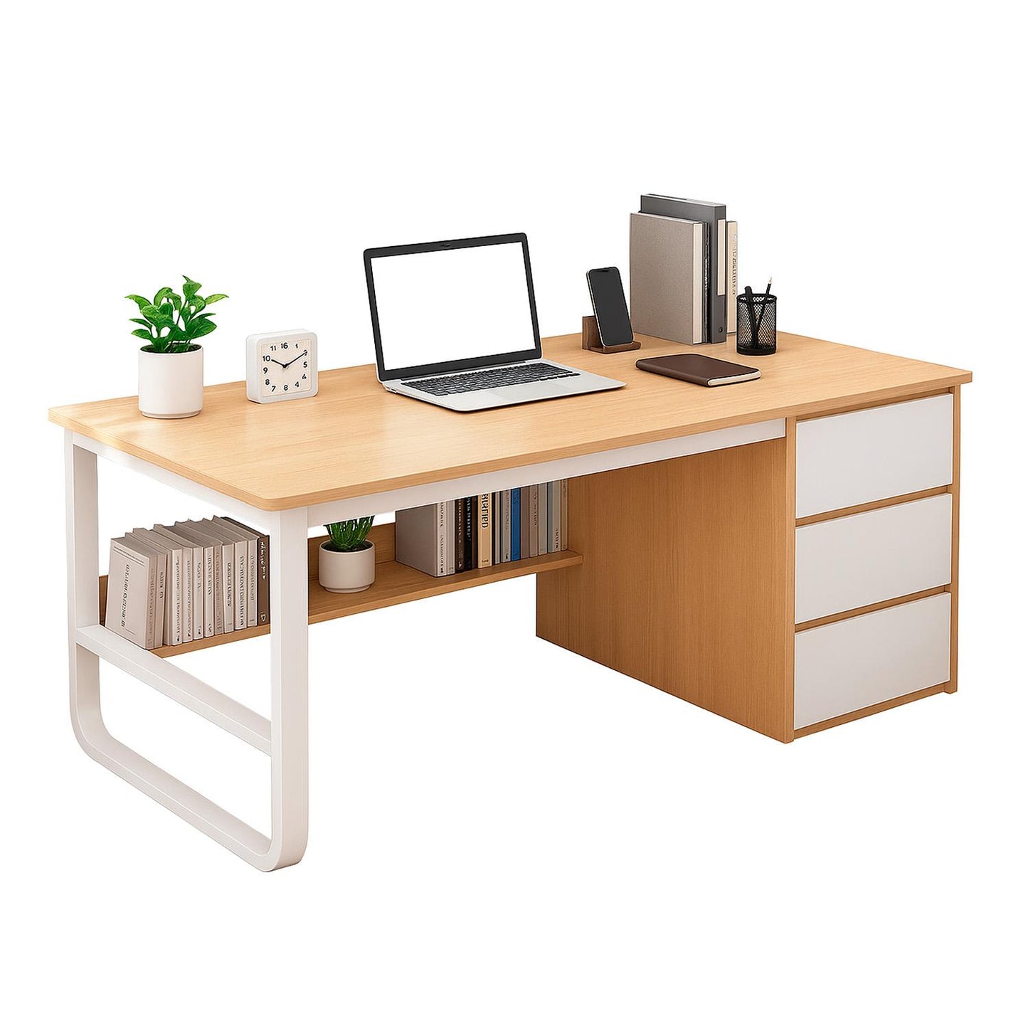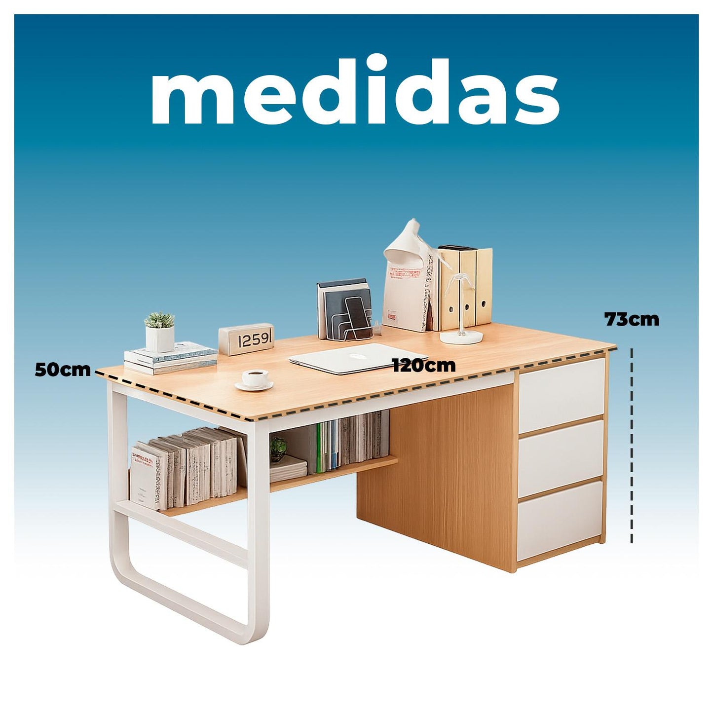 Renueva tu espacio con este escritorio amplio de acabado roble claro y detalles blancos. Su diseño une elegancia, funcionalidad y máxima capacidad de almacenamiento: