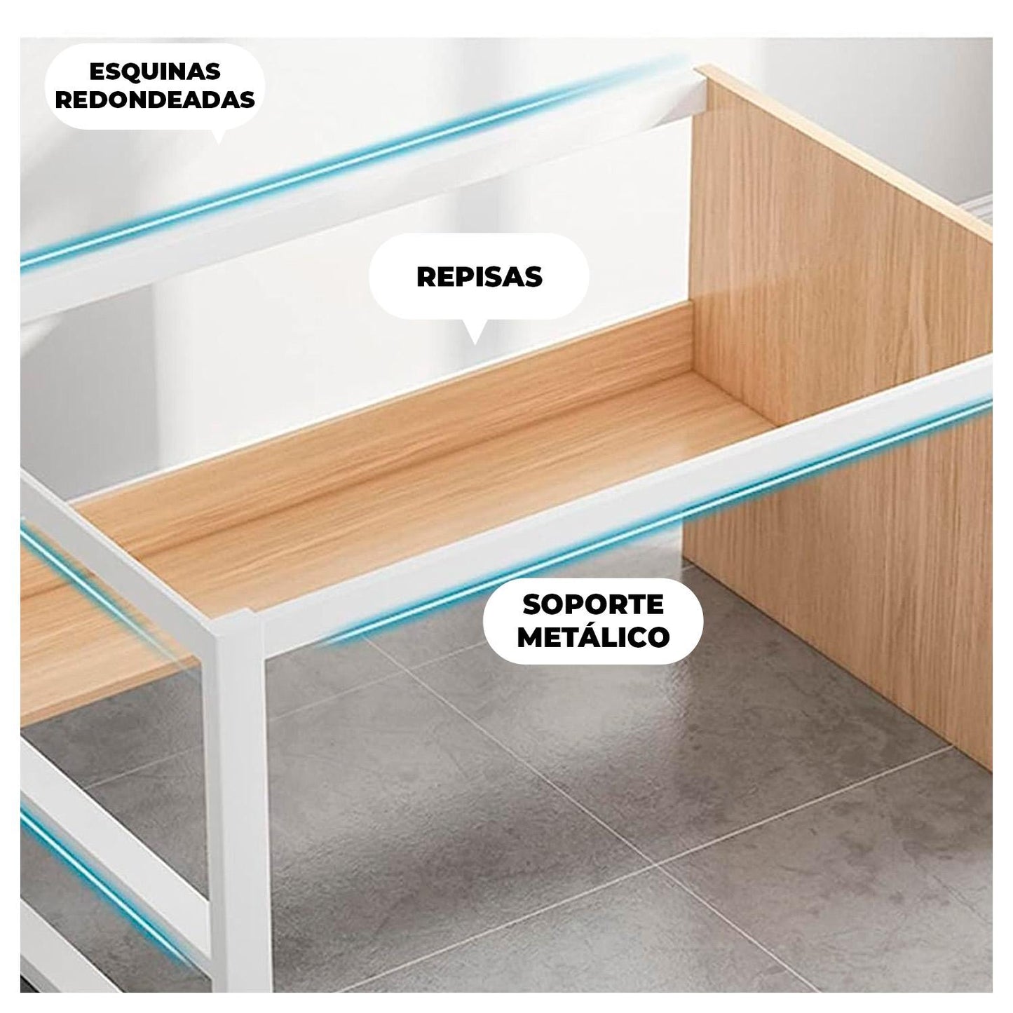 Estructura robusta en MDF y acero pintado que soporta la rutina diaria sin tambaleos.