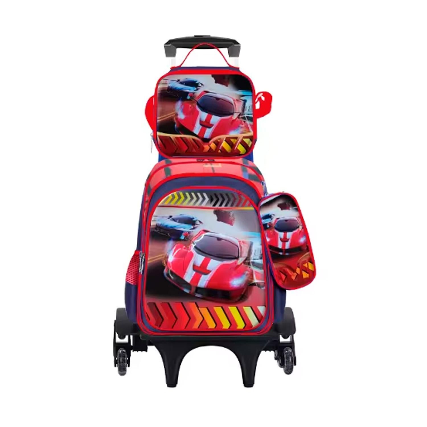 ¡El regreso a clases será una aventura a toda velocidad con esta increíble mochila de autos deportivos! Este set 3 en 1 incluye mochila con ruedas, lonchera térmica y cartuchera, diseñada para niños que aman la adrenalina y los motores.