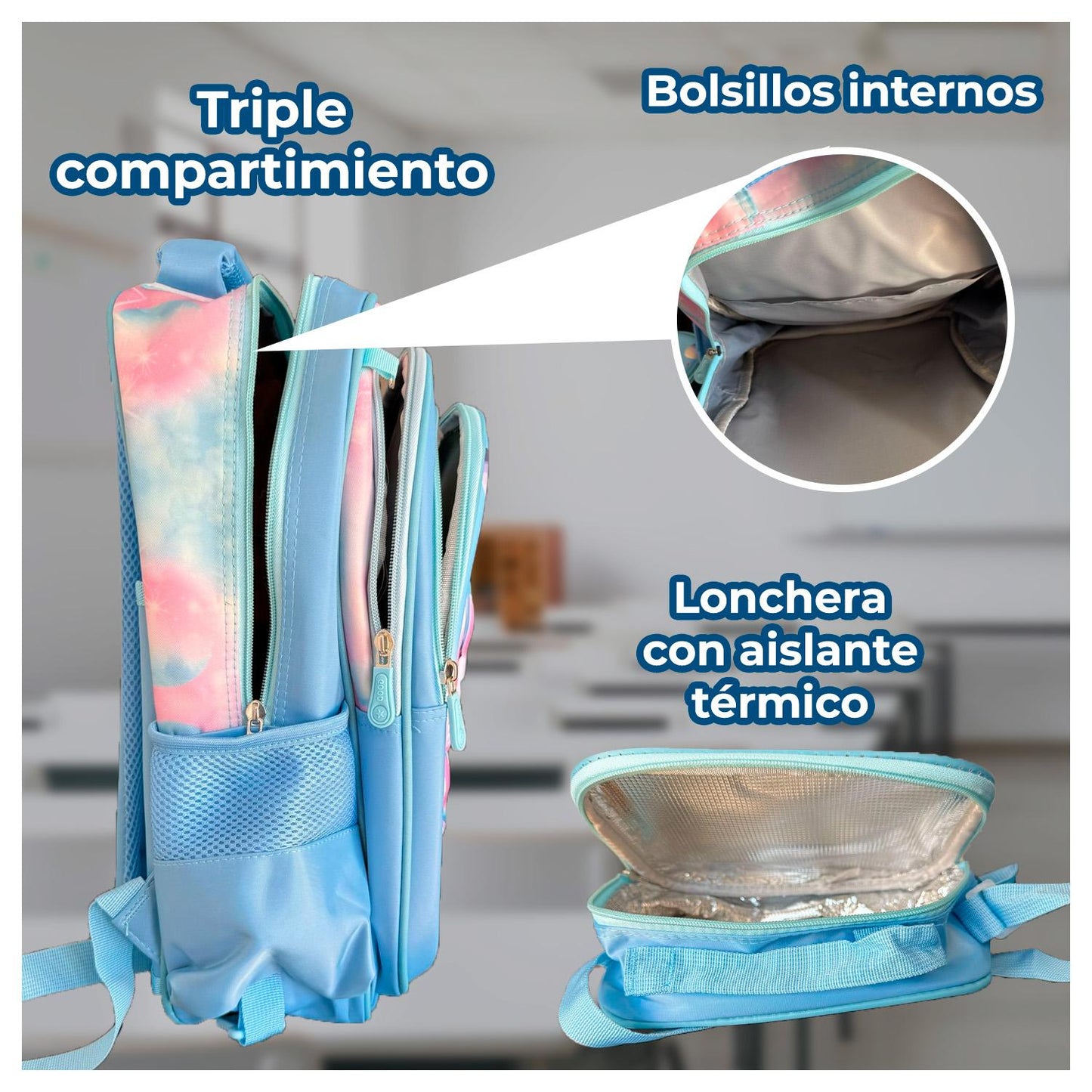 • Excelente organización: Sus amplios compartimentos y bolsillos laterales facilitan la organización de libros, útiles y otros accesorios, asegurando que todo esté en su lugar y al alcance y cierres resistentes que garantizan durabilidad y un uso prolongado.