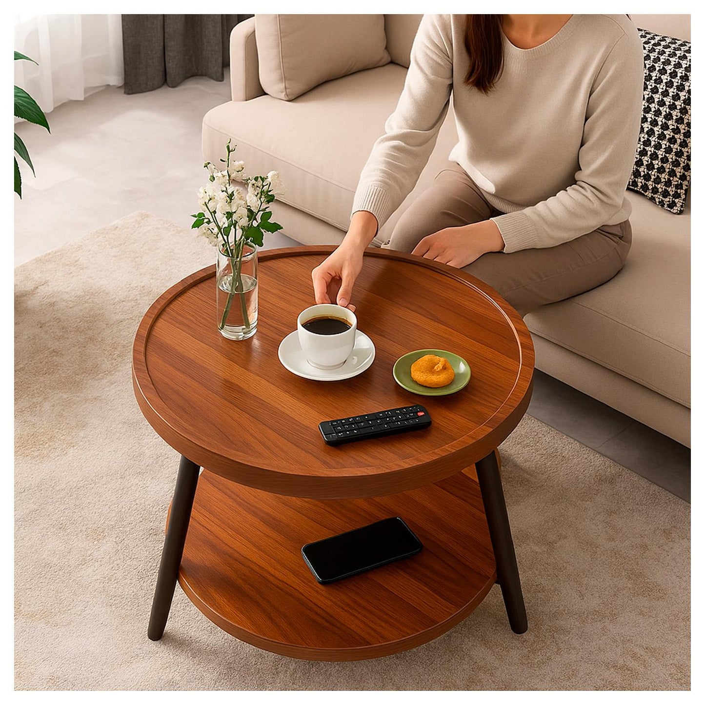 Renueva tu sala con esta mesa de centro moderna. Su diseño redondo y acabado en madera le aportan un toque cálido y cómodo a cualquier espacio. Además, su doble nivel de almacenamiento te permite organizar libros, revistas o decoraciones fácilmente. Ideal para hogares modernos, minimalistas o rústicos.