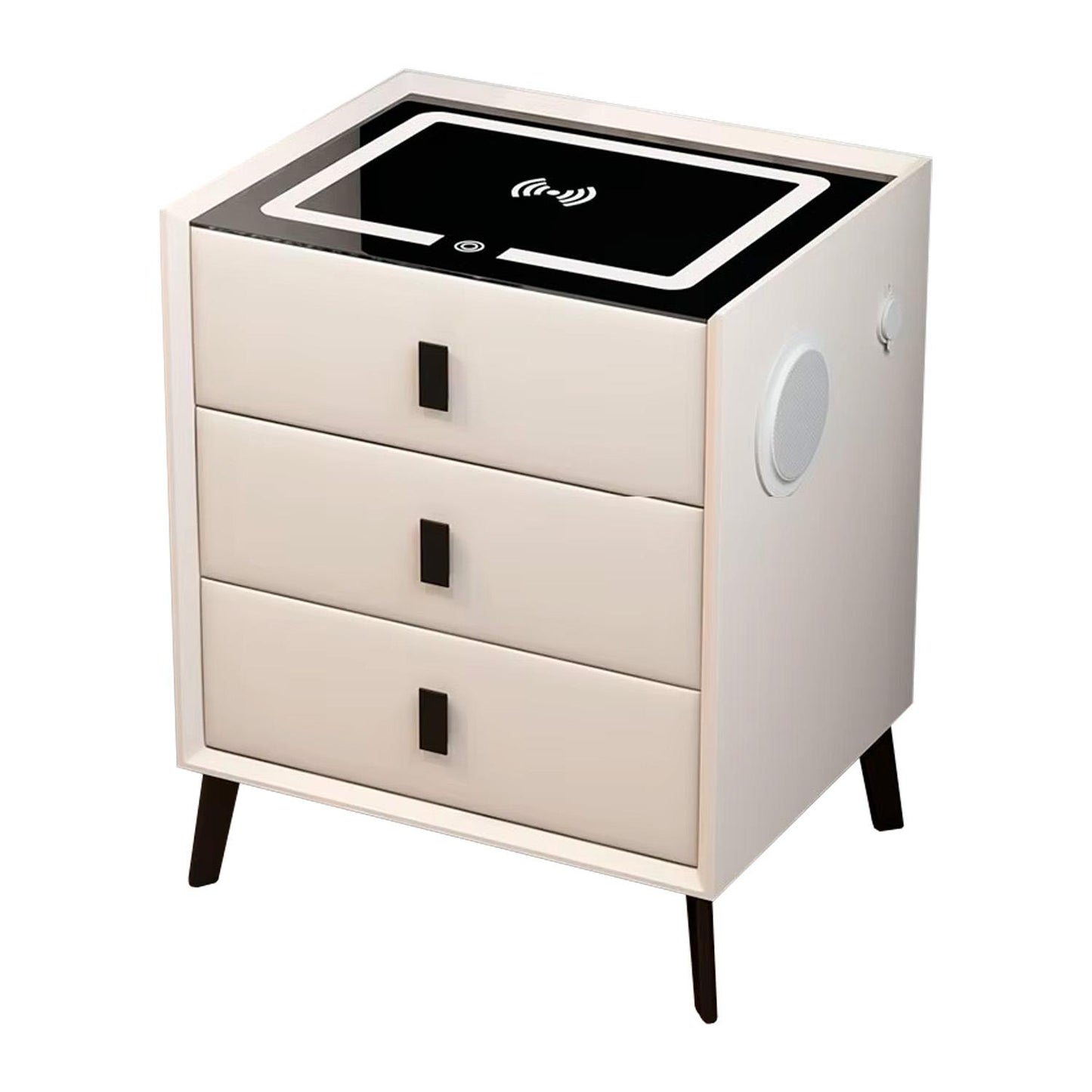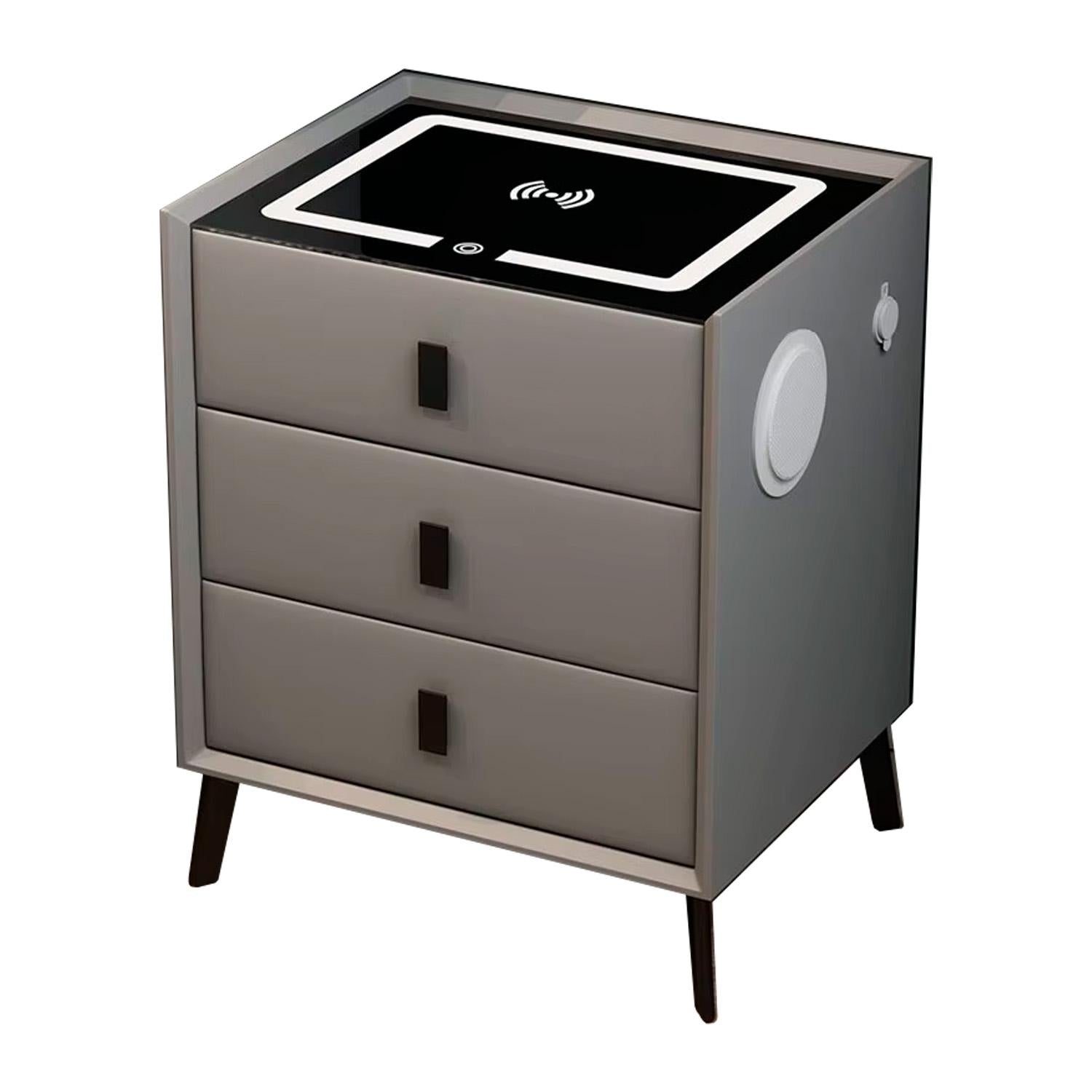 Esta mesita de noche inteligente está diseñada para elevar tu experiencia de descanso y comodidad. Con un diseño elegante y minimalista, incorpora tecnología de vanguardia para hacer tu día a día más fácil. Sus tres cajones espaciosos te permiten mantener todo organizado, mientras que su superficie multifuncional integra carga inalámbrica para tu celular, parlantes Bluetooth para disfrutar de tu música favorita y un sistema de iluminación LED para un toque moderno en tu habitación.