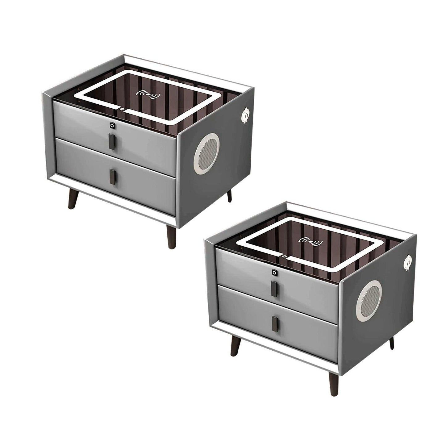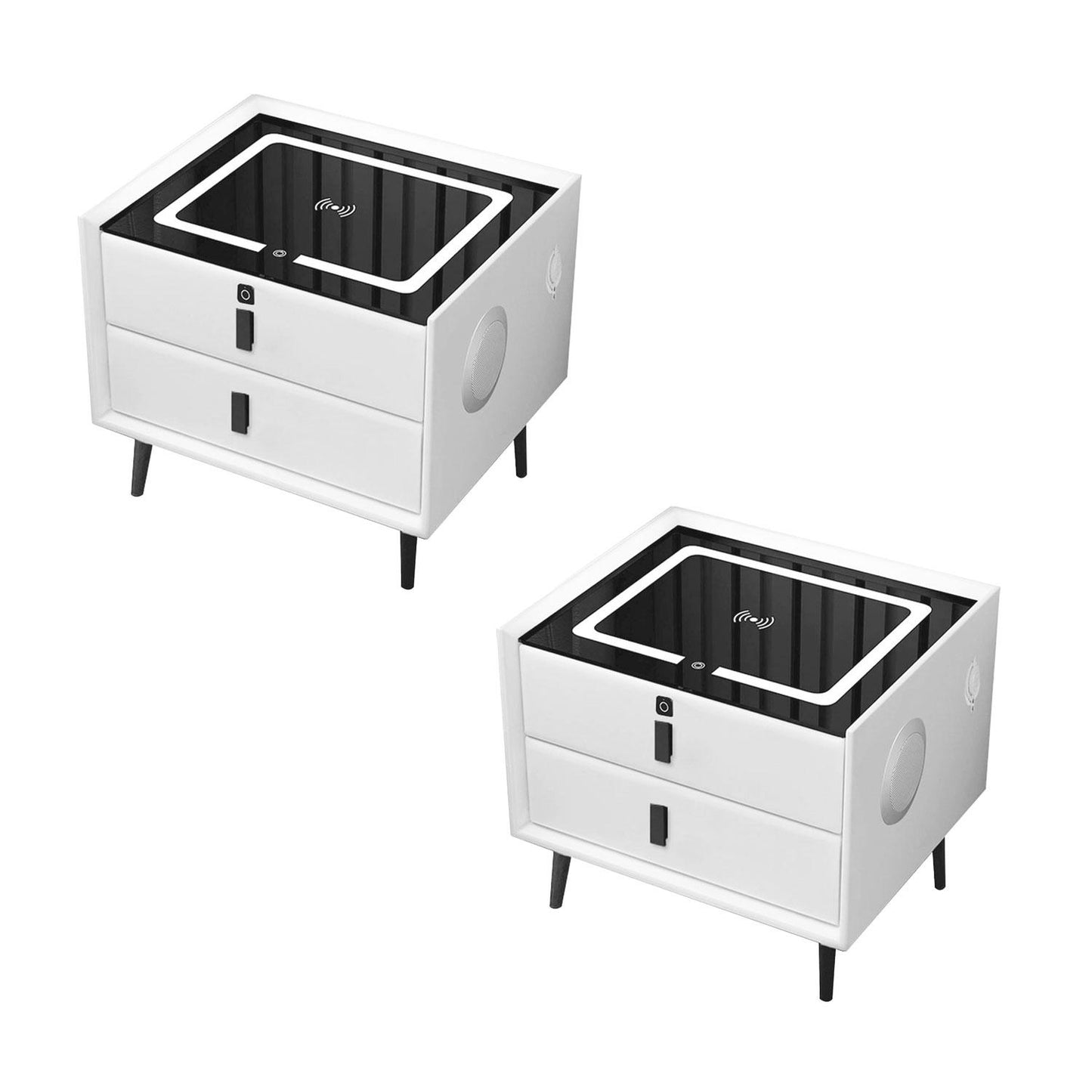 Pack 2 Veladores con estación de carga inalámbrica, puerto USB, luces LED de 3 colores, Parlantes, mesa auxiliar de madera moderna para dormitorio y sala de estar, 2 cajones de almacenamiento