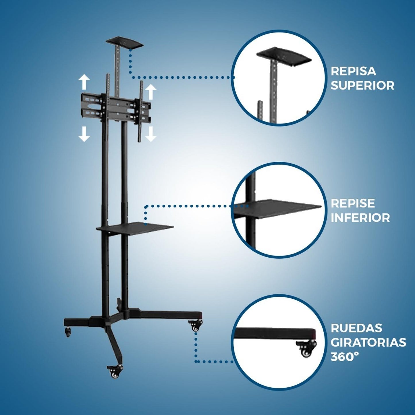 • Movilidad y Flexibilidad : Equipado con ruedas, permite un fácil desplazamiento del televisor entre diferentes habitaciones o áreas, ofreciendo flexibilidad en la disposición del espacio.