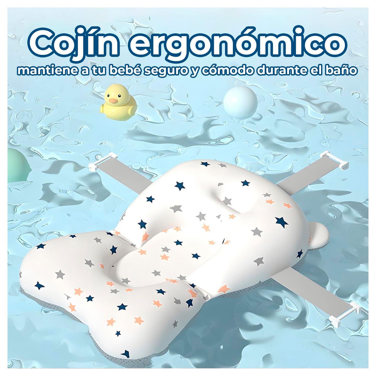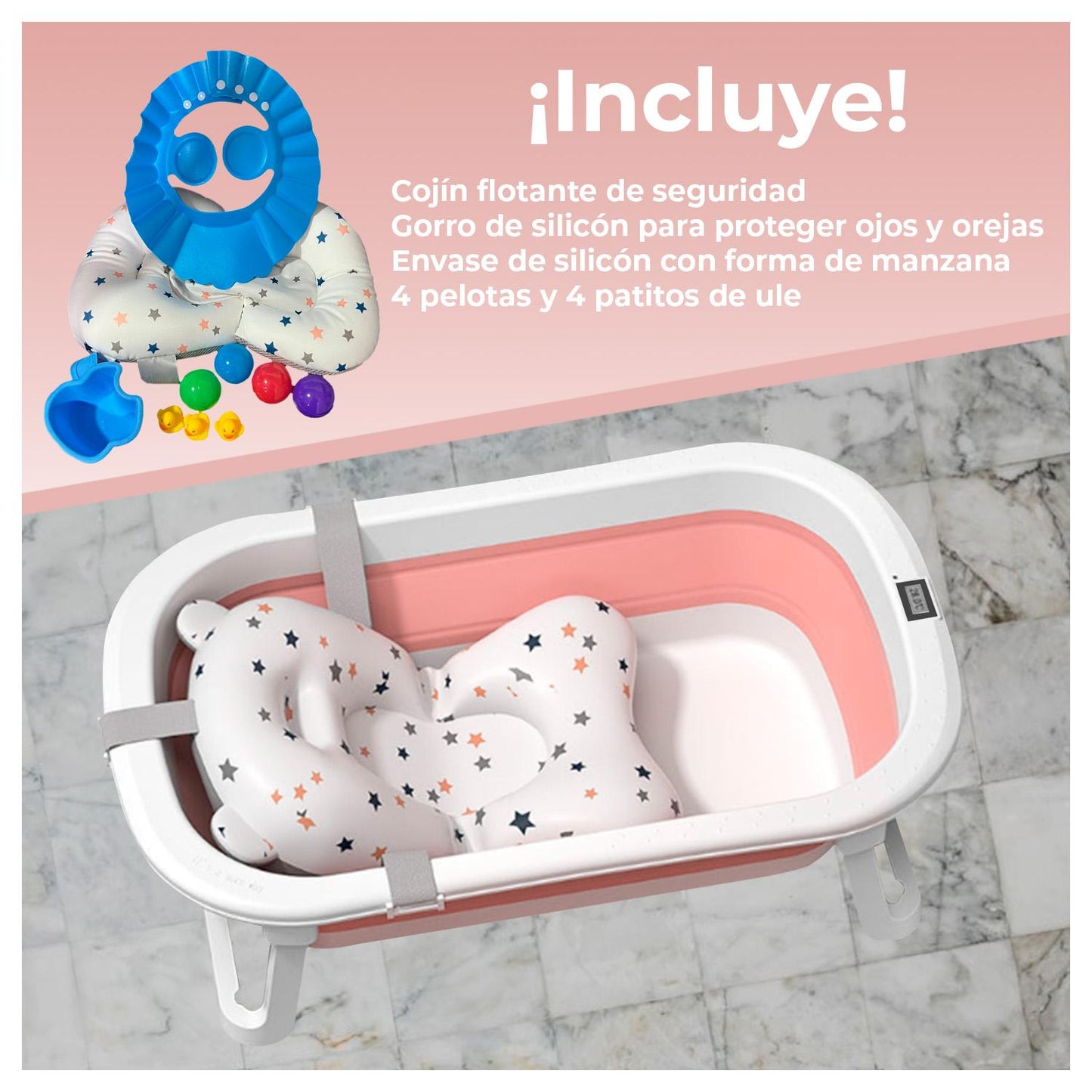 • Incluye Termómetro, protector de Ojos (evita el contacto con el Champú), 5 pelotas y 2 patitos de juguetes.