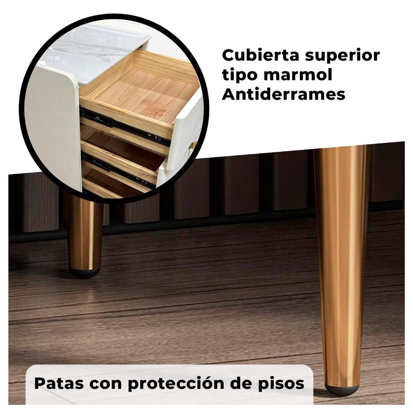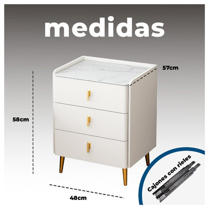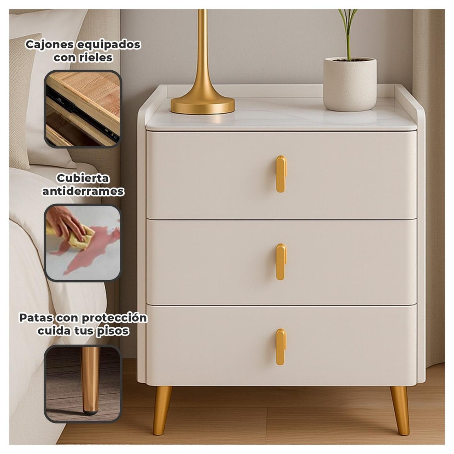 Este velador blanco de 3 cajones con detalles dorados es la mezcla perfecta entre elegancia y utilidad. Su diseño moderno destaca por su cubierta superior tipo mármol, ideal para apoyar lámparas, libros o decoración. Además, sus cajones cuentan con rieles para una apertura suave, y sus patas con protección cuidan tus pisos.
