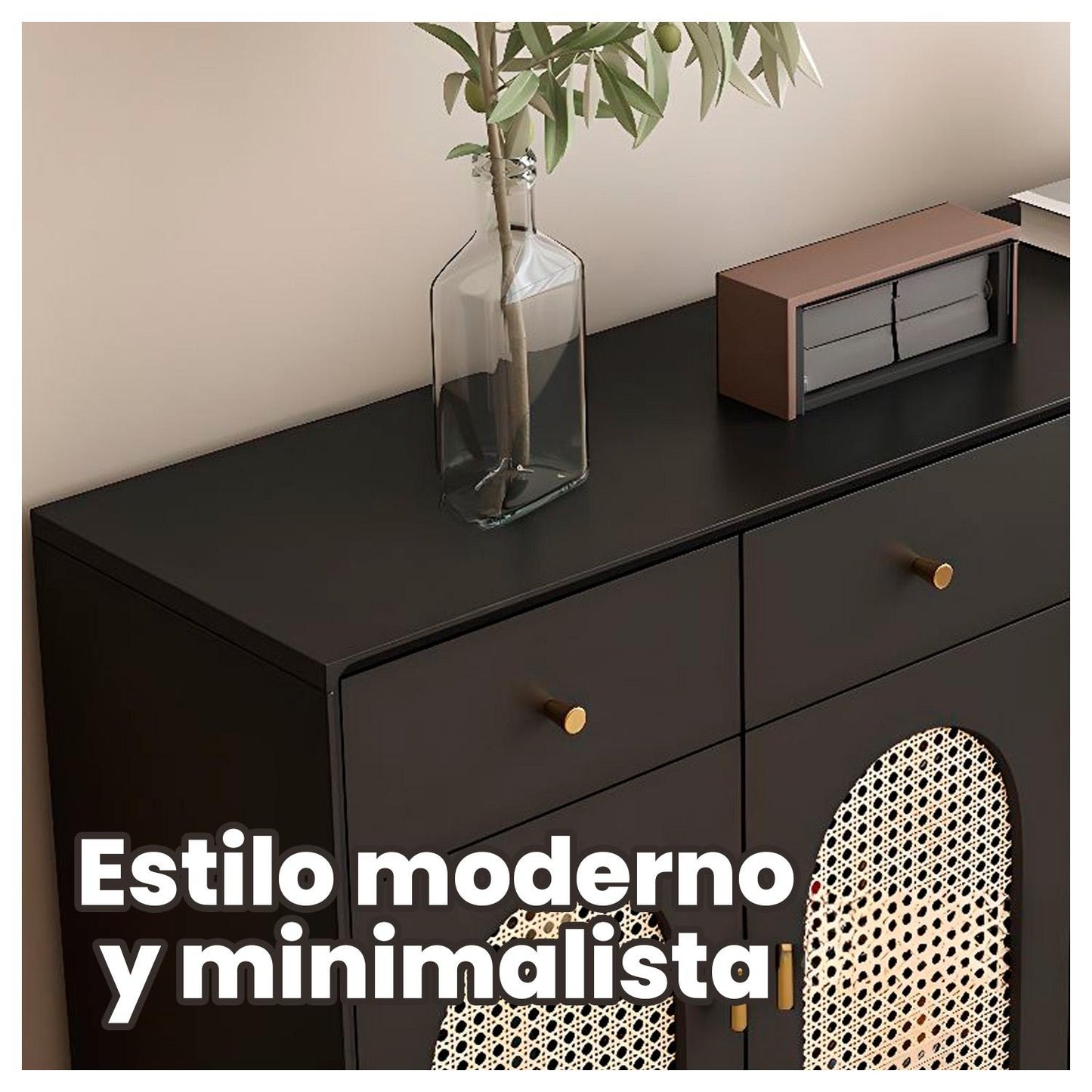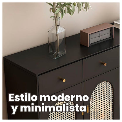 Diseño Clásico y Moderno: Estructura en negro con detalles en ratán que aportan calidez y estilo