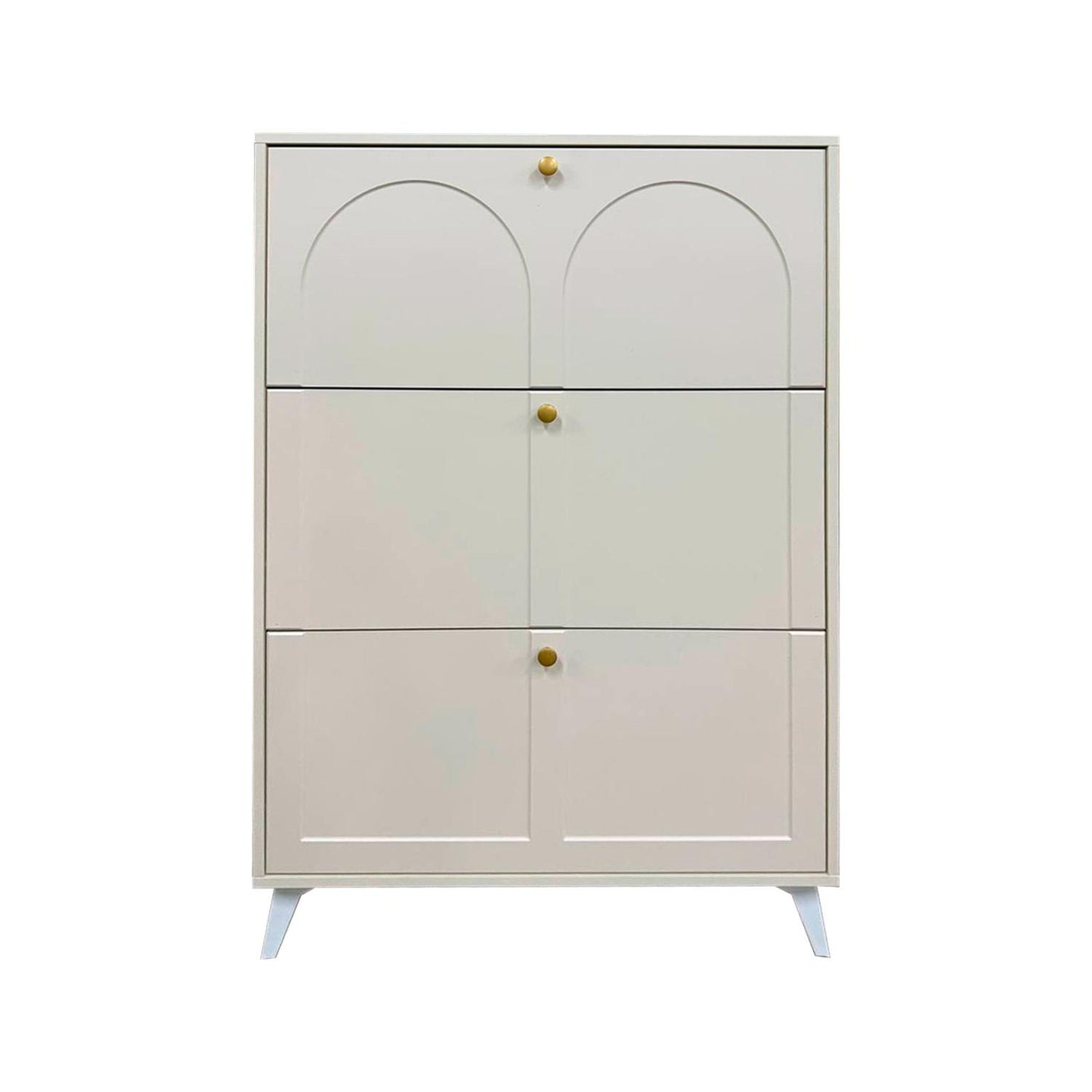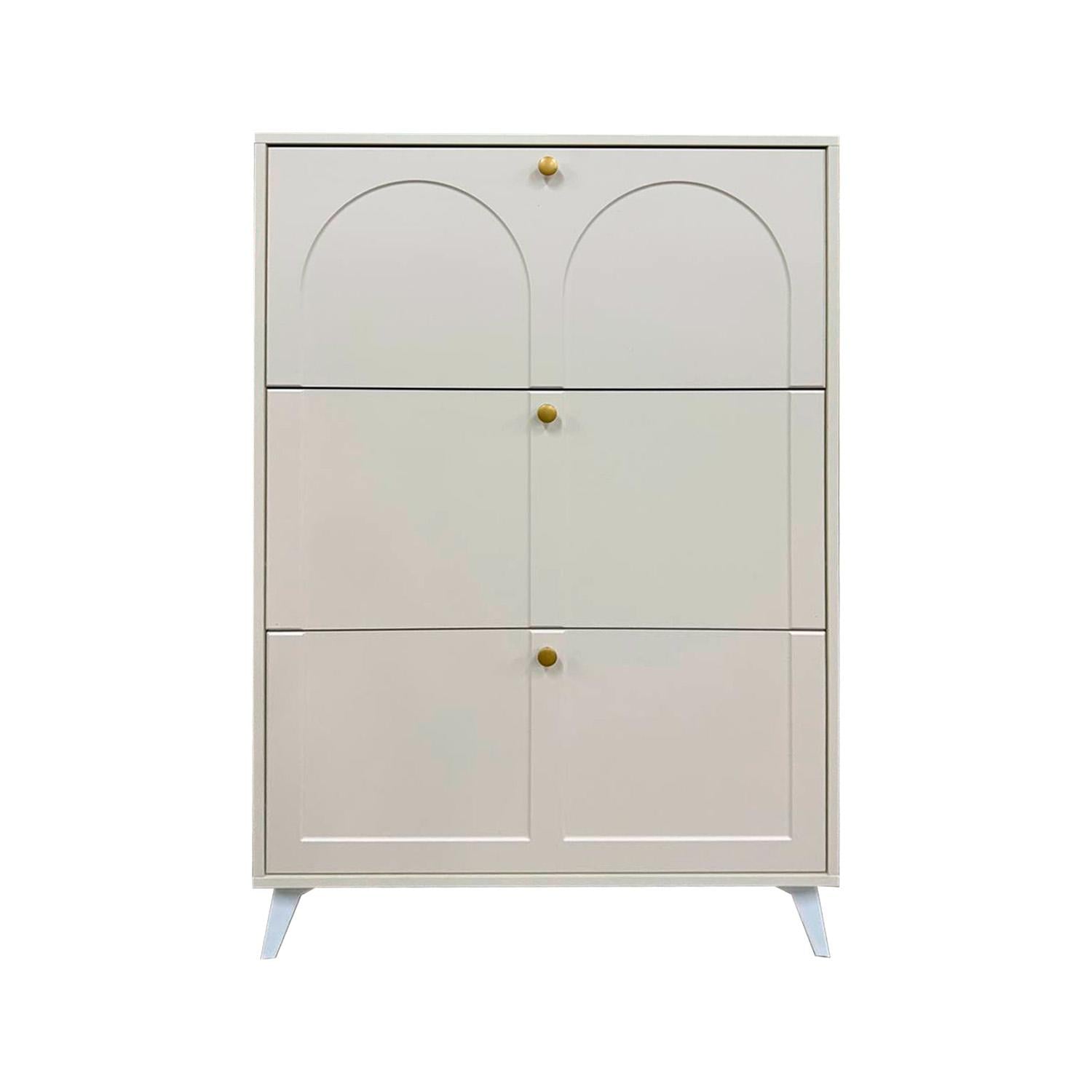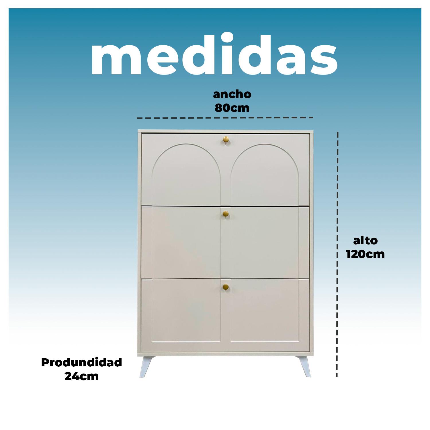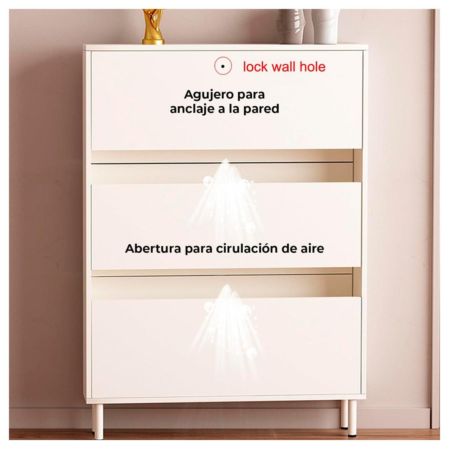 Dale un toque de elegancia y organización a tu hogar con esta zapatera de diseño minimalista. Con capacidad para hasta 24 pares de zapatos, su sistema de apertura abatible optimiza el espacio, manteniendo tu calzado protegido y siempre a la mano. Su estructura robusta y acabado en color blanco con detalles dorados la convierten en la pieza perfecta para cualquier ambiente. ¡Haz de tu entrada, dormitorio o vestidor un lugar más ordenado y estilizado con este increíble mueble